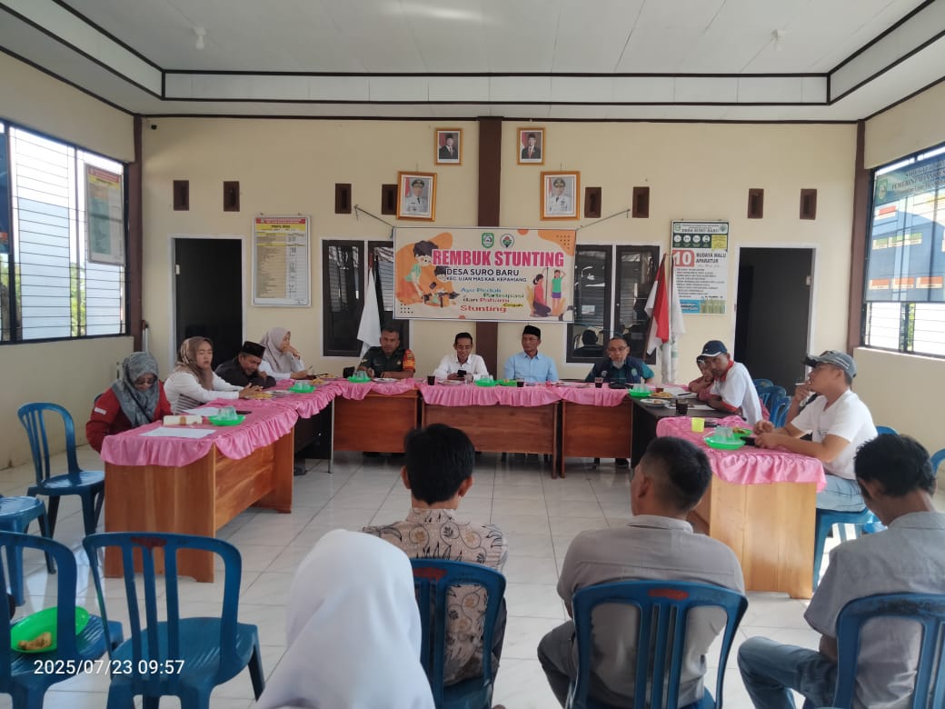 Kepahiang,Transtv46.com_23 Juli 2025 – Pemerintah Desa Suro Baru, Kecamatan Ujan Mas, Kabupaten Kepahiang melaksanakan kegiatan rembuk stunting yang berlangsung di Balai Desa Suro Baru dengan melibatkan berbagai unsur terkait.