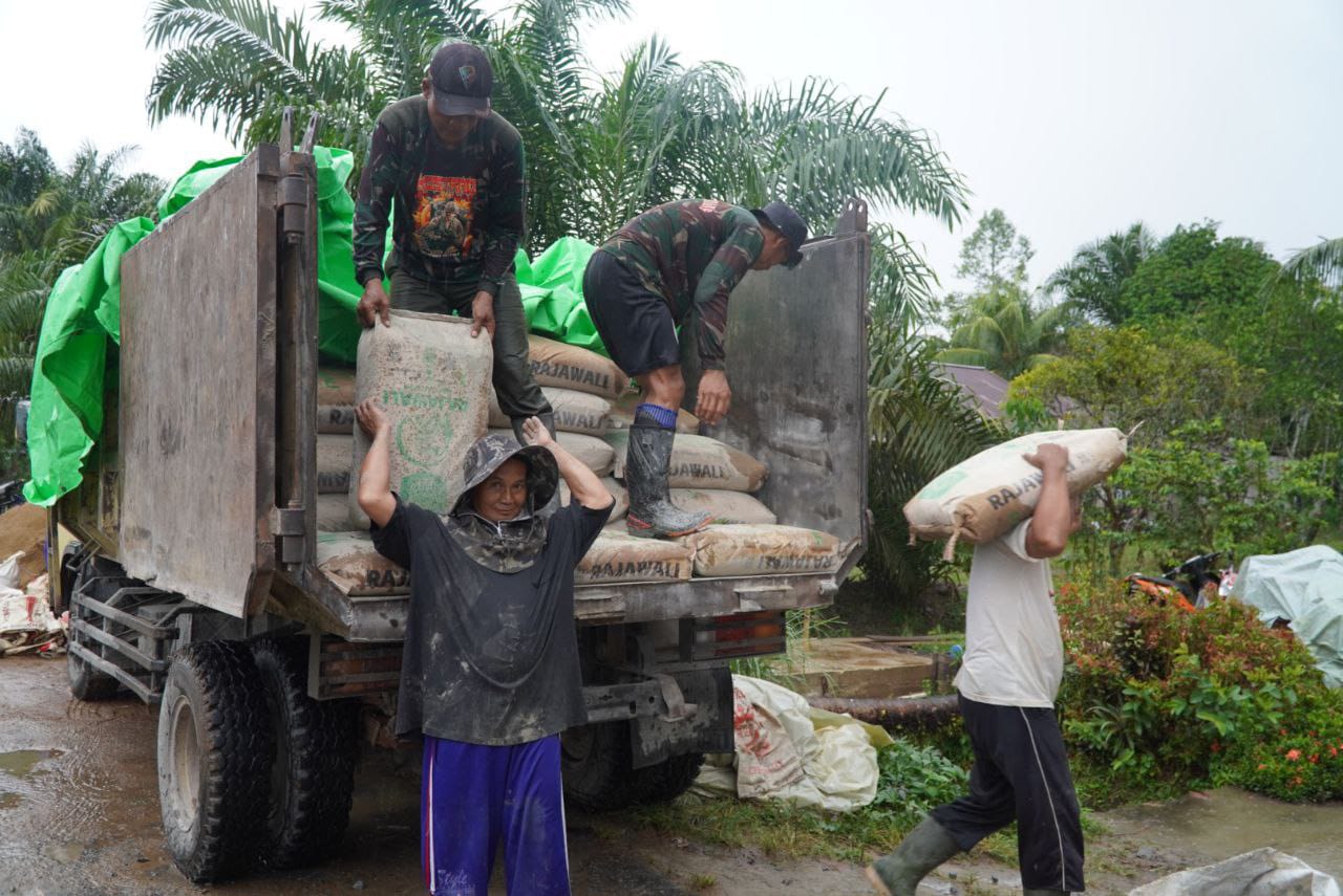 Meski kondisi cuaca sempat tidak menentu, hal itu tidak menyurutkan semangat anggota Satgas TMMD untuk tetap bekerja maksimal. Dengan cara memanggul semen secara manual, para prajurit memastikan bahan bangunan dapat segera sampai di titik pengerjaan rabat beton dan sasaran fisik lainnya.