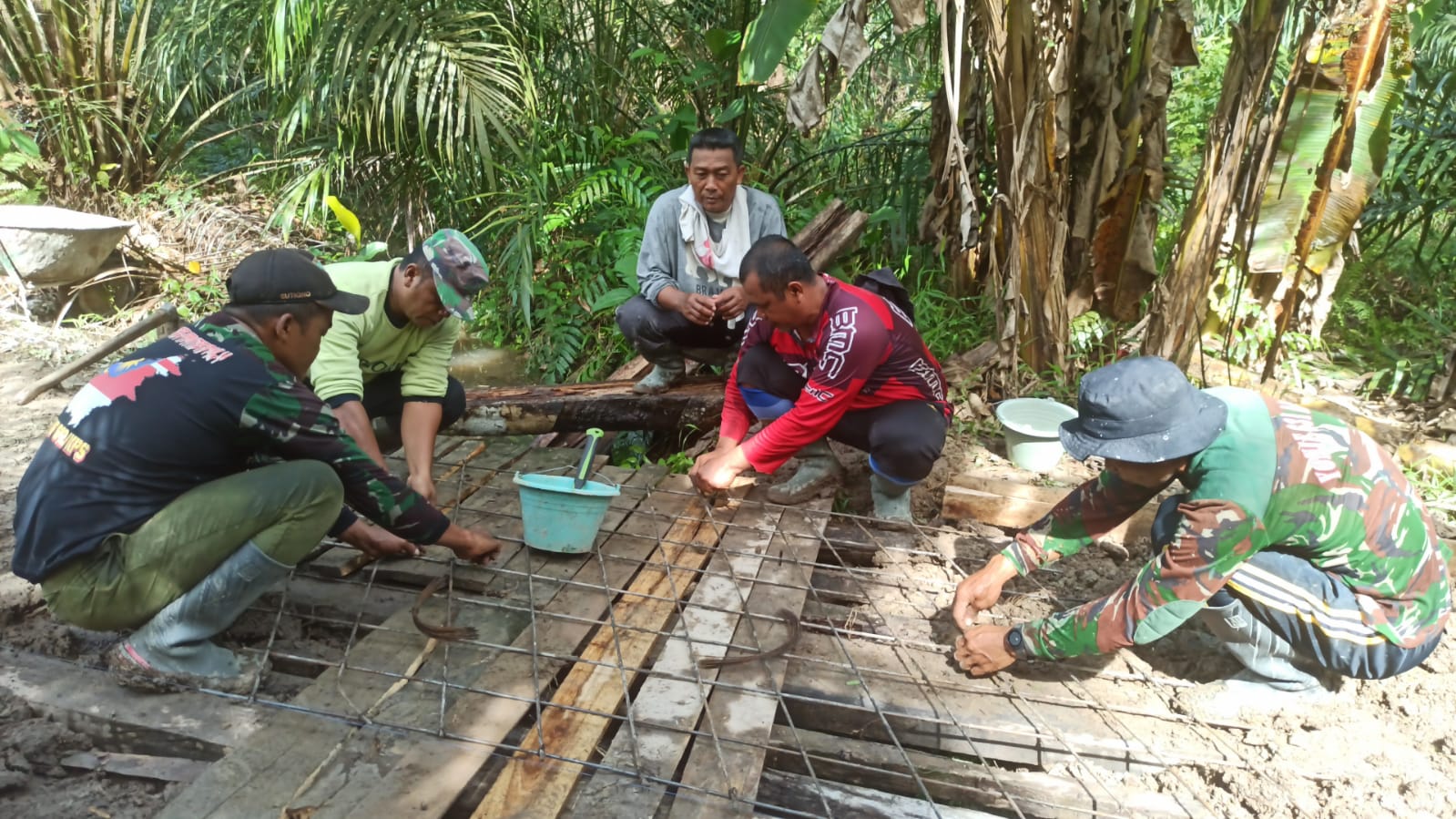 Pemasangan besi ini dilakukan untuk memperkuat struktur pondasi jembatan agar mampu menahan beban kendaraan dan aktivitas masyarakat di kemudian hari. Dengan kerja sama dan semangat gotong royong antara personel Satgas dan warga setempat, proses pengerjaan berjalan lancar.