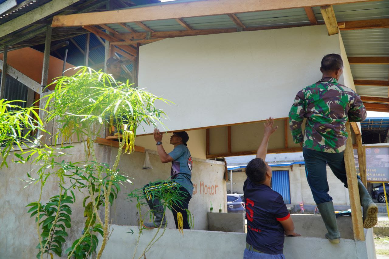 Dengan semangat gotong royong, anggota Satgas TMMD bersama warga bahu-membahu dalam proses pemasangan. Hal ini mencerminkan kemanunggalan TNI dan rakyat yang menjadi roh utama program TMMD.