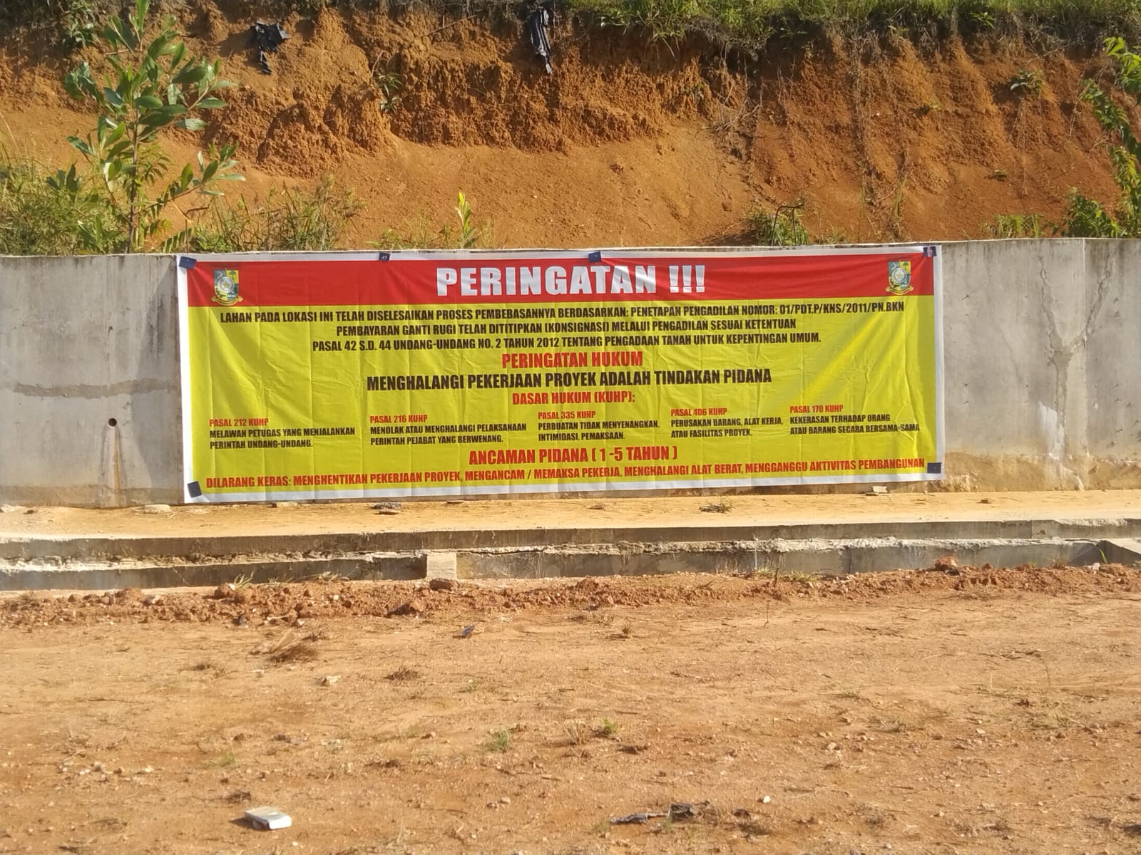 Ada peringatan hukum bahwa menghalangi pekerjaan proyek kepentingan umum adalah tindak pidana