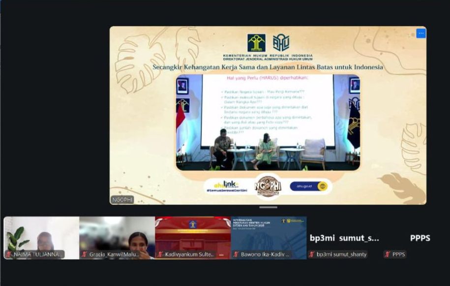 Hal tersebut ditunjukkan melalui keikutsertaan Bidang Pelayanan Administrasi Hukum Umum (AHU) dalam Diskusi Publik “Ngobrol Bareng OPHI (NGOPHI)” yang digelar secara virtual melalui Zoom Meeting, Kamis (4/12/2025), bertempat di Ruang Divisi Pelayanan Hukum.