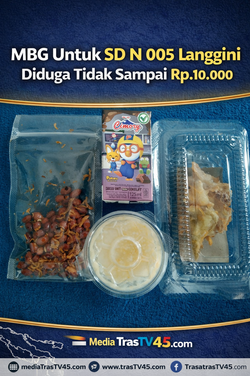 Kampar Riau, TransTV45.com ||Program Makan Bergizi Gratis (MBG) untuk SD Negeri 005 Langgini Kelurahan Langgini Kecamatan Bangkinang Kota Kabupaten Kampar Provinsi Riau diduga tidak sampai seharga Rp.10.000 untuk per siswa untuk kelas 4 sampai 6.