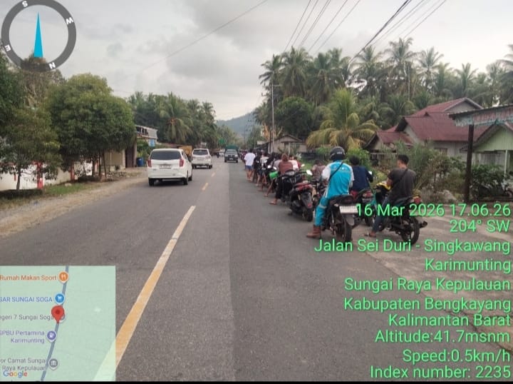 Sungai Raya, Bengkayang Kalbar – TransTV45.com || Breaking news Cerita antrian panjang BBM masih berjalan sampai kini, antrian panjang di SPBU Desa Sungai Raya, kecamatan Sungai Raya Kepulauan, Kabupaten Bengkayang. Senin (16/03/2026)