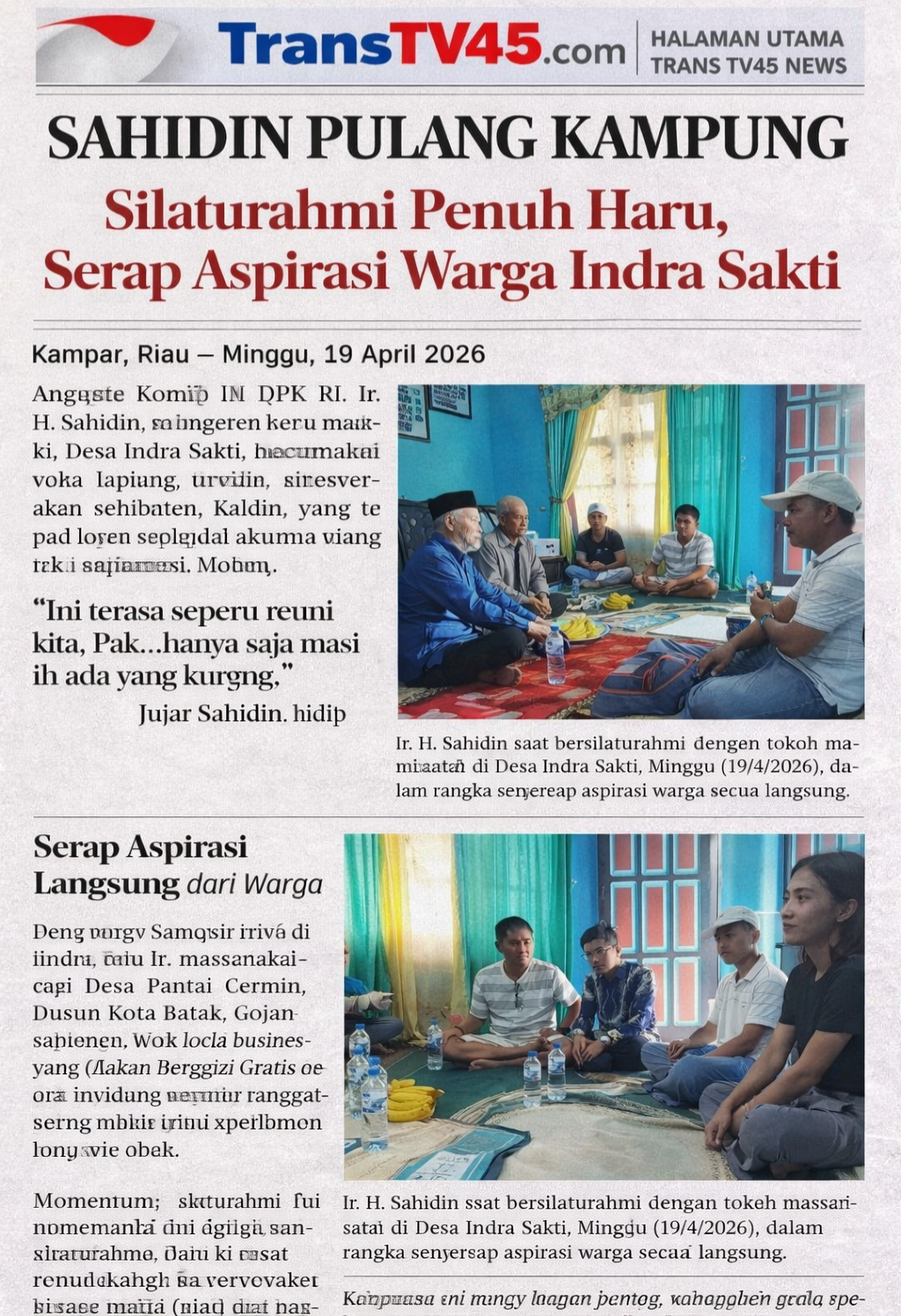 Kampar Riau, TransTV45.com || Anggota Komisi IX DPR RI, Ir. H. Sahidin, mengawali kunjungannya ke Desa Indra Sakti, Kecamatan Tapung, dengan menyambangi kediaman tokoh masyarakat setempat, Kaldin, yang telah lama dianggap sebagai orang tua angkatnya Minggu, 19 April 2026