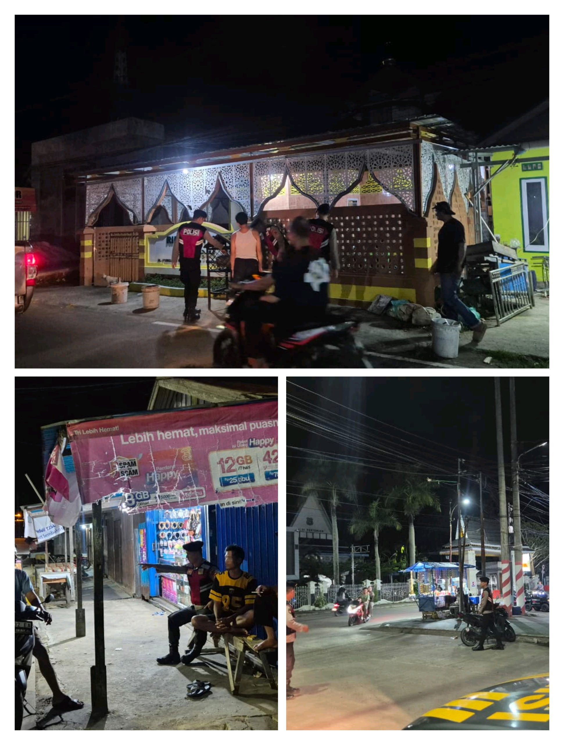 Personel kepolisian berinteraksi langsung dengan warga yang masih beraktivitas di malam hari, seperti petugas keamanan lingkungan (Satpam) dan warga di pos ronda.